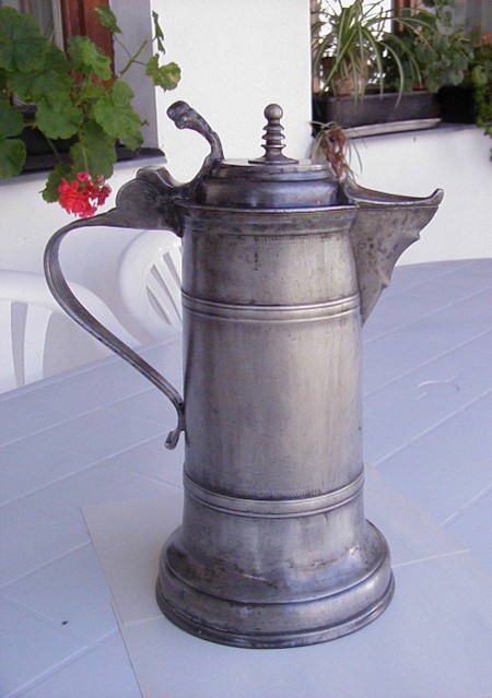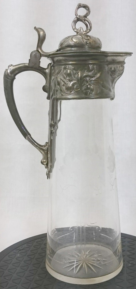 1. Szecessziós díszítésű boros kanna Anyaga: öntött, cizellált, ezüstözött fém fogantyú és csis…
