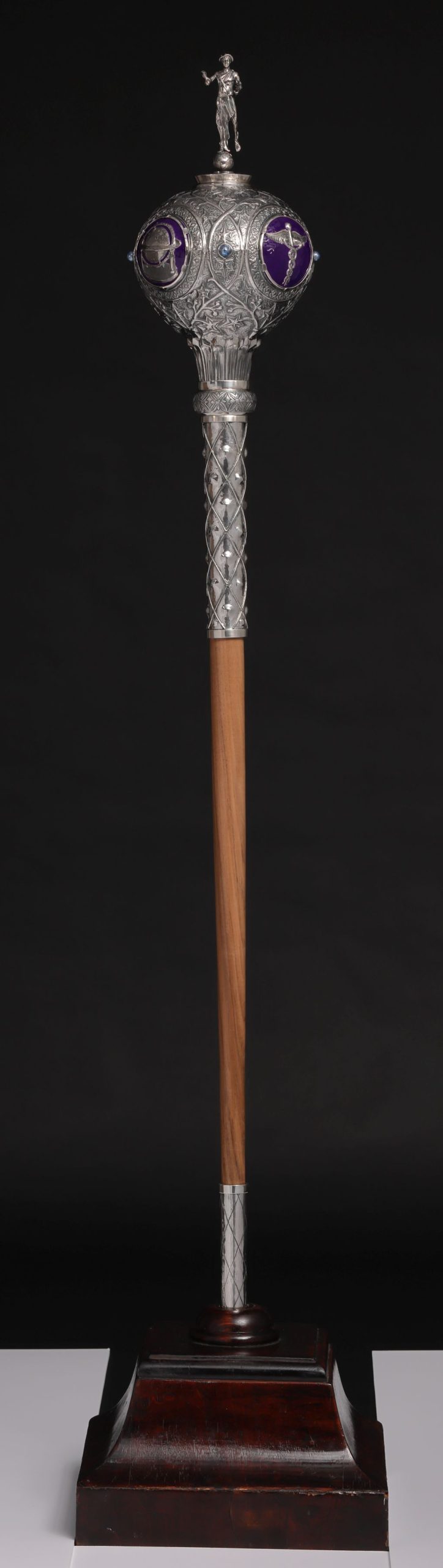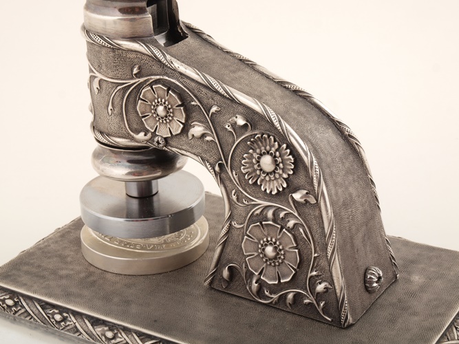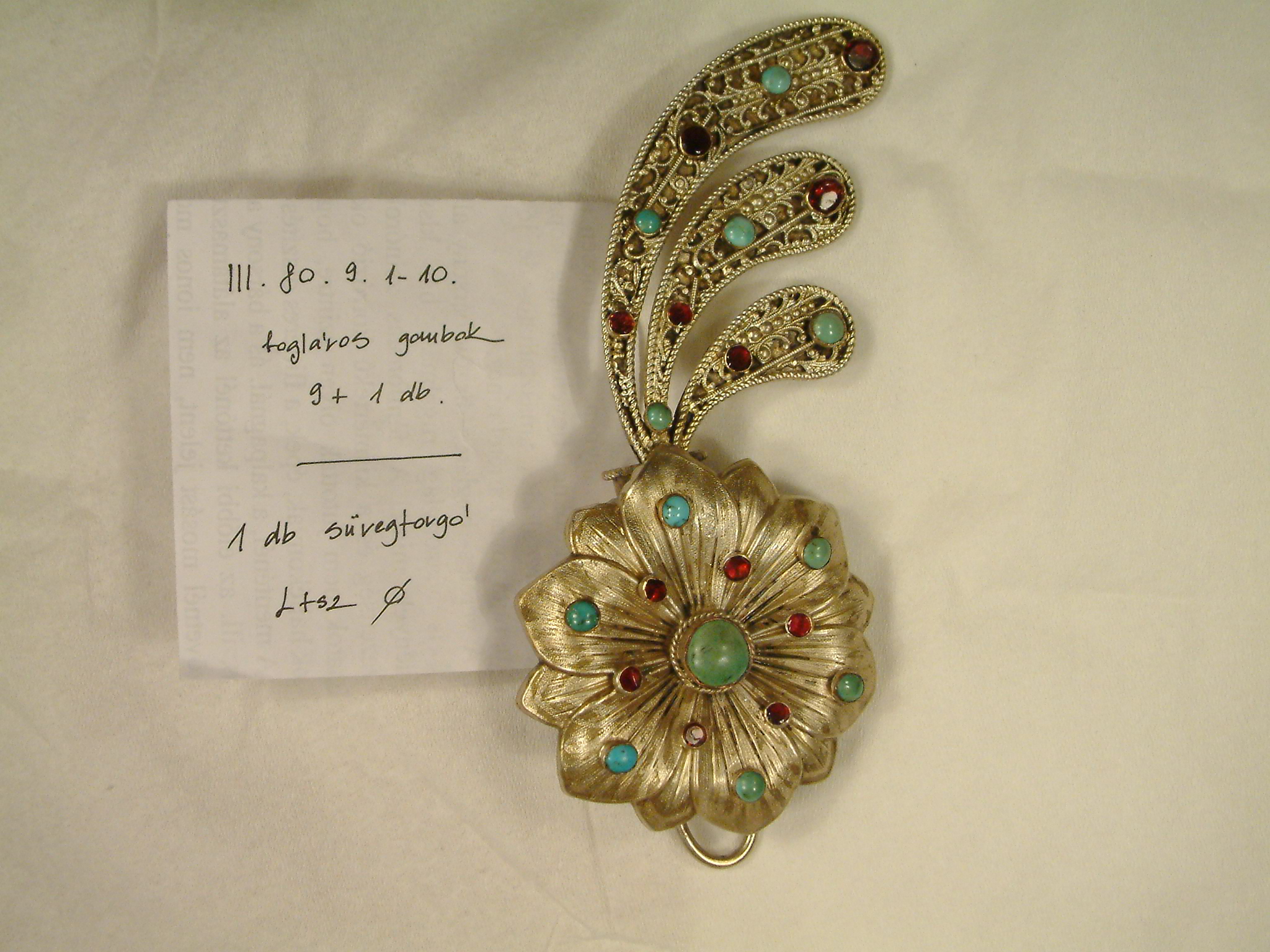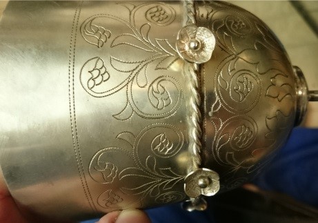 1. Szecessziós díszítésű boros kanna Anyaga: öntött, cizellált, ezüstözött fém fogantyú és csis…