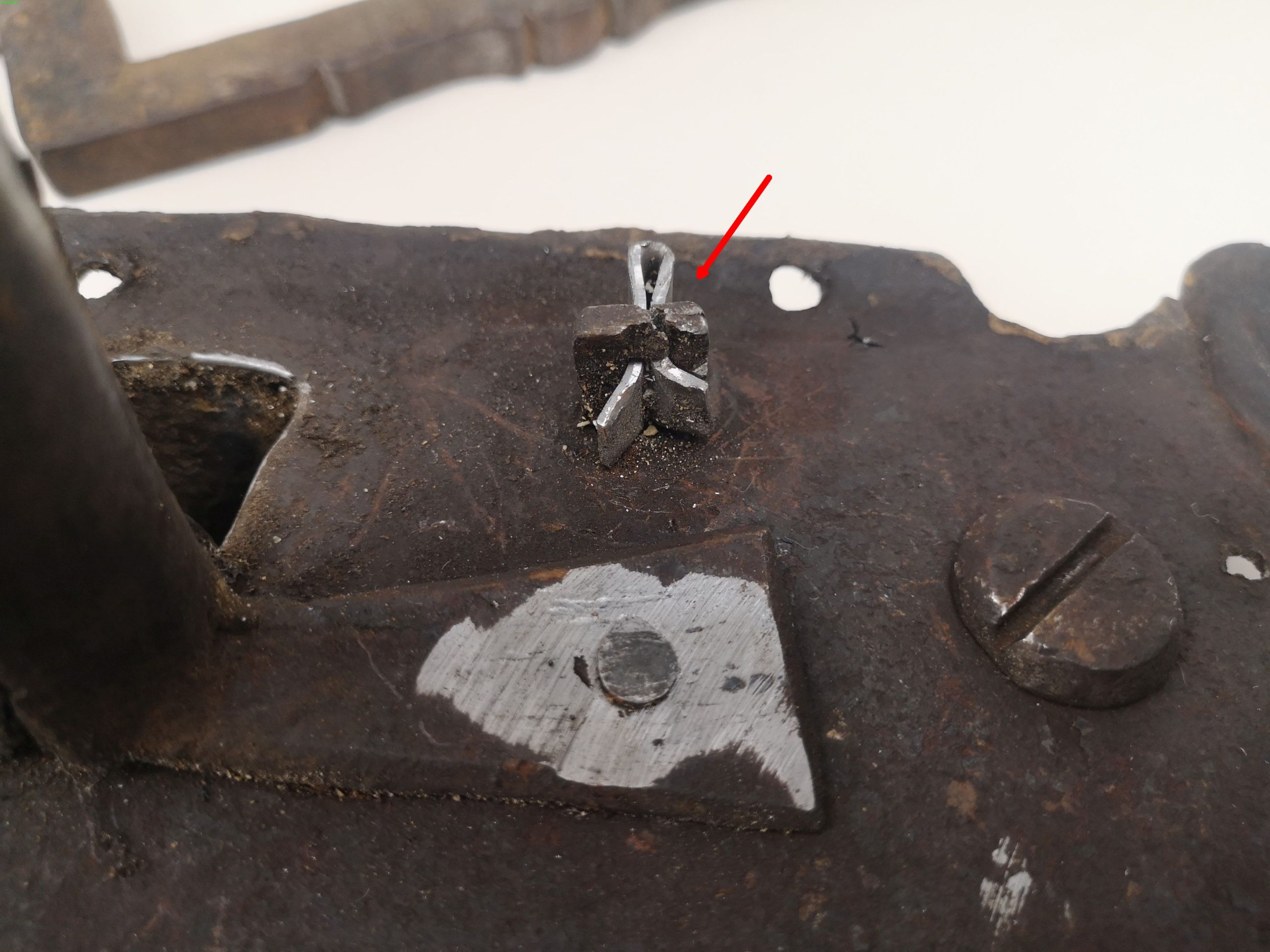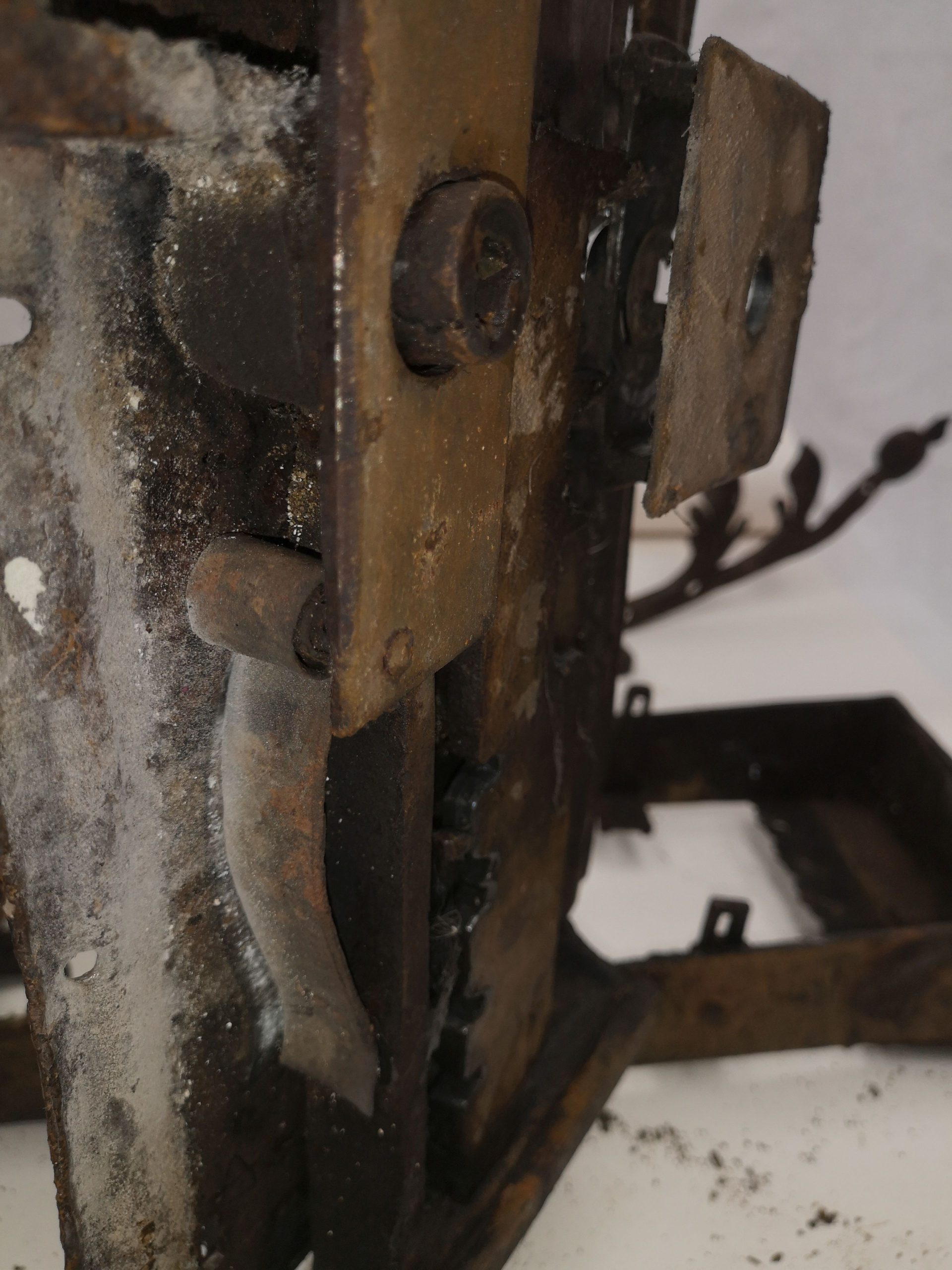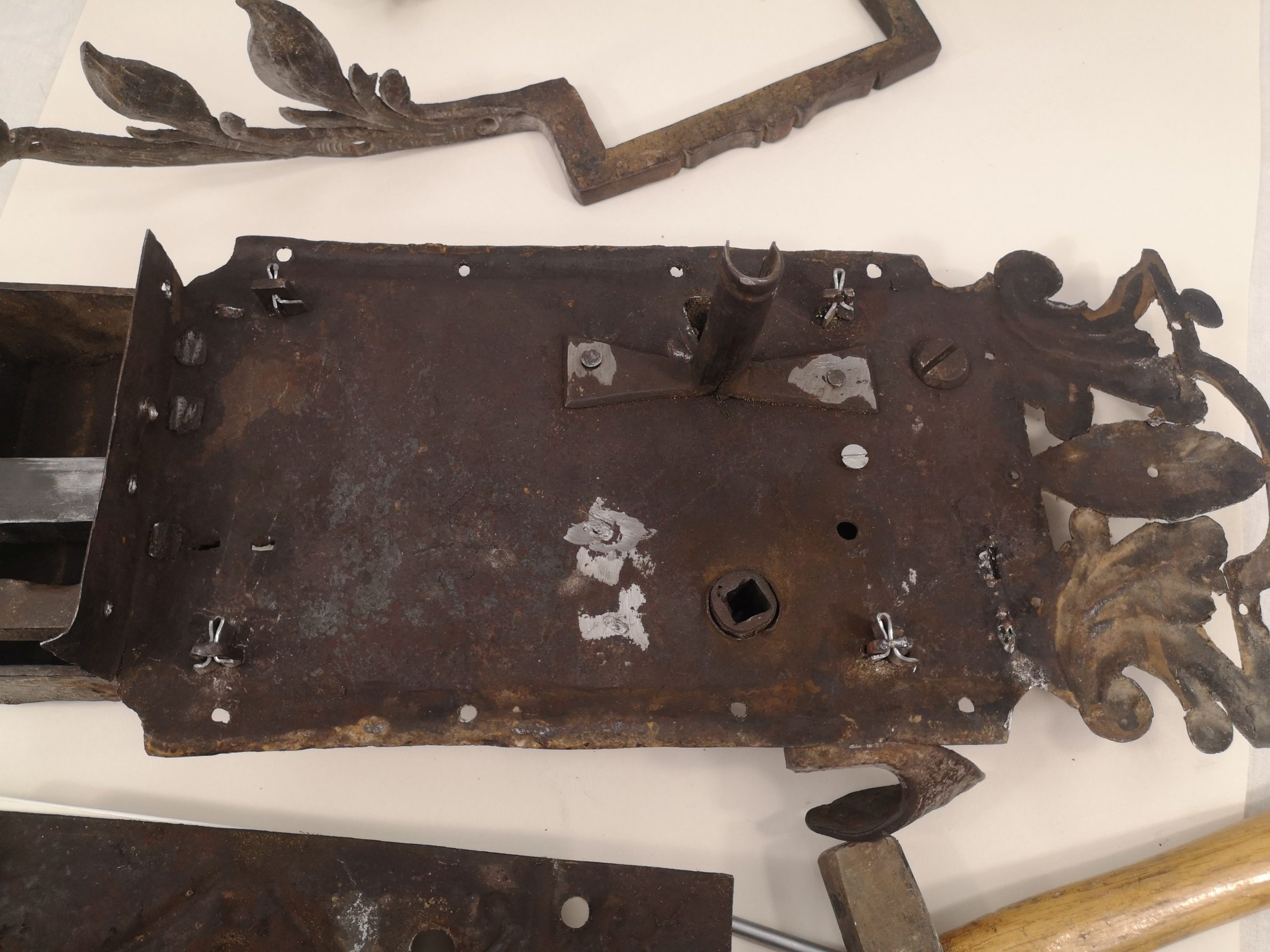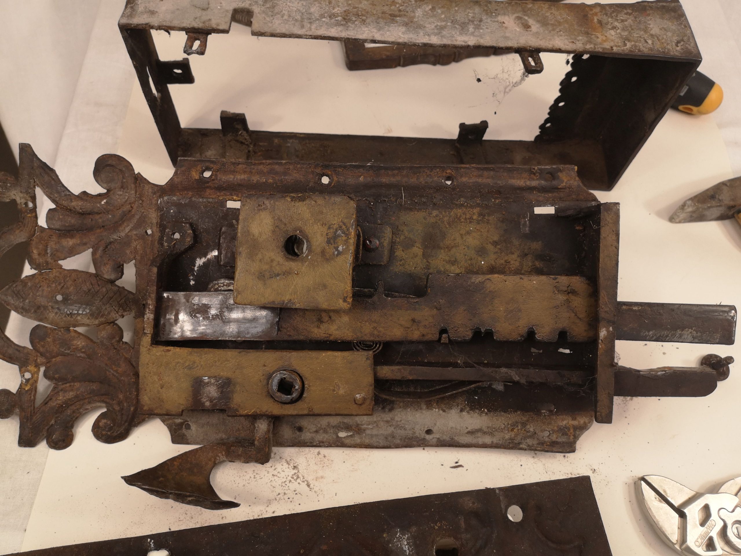 A szétszerelt zár hibái: korrodált, szennyezett, nyomokban még látható a régi festés, deformálódott, hiányos, szakszerűtlenül „javított”.