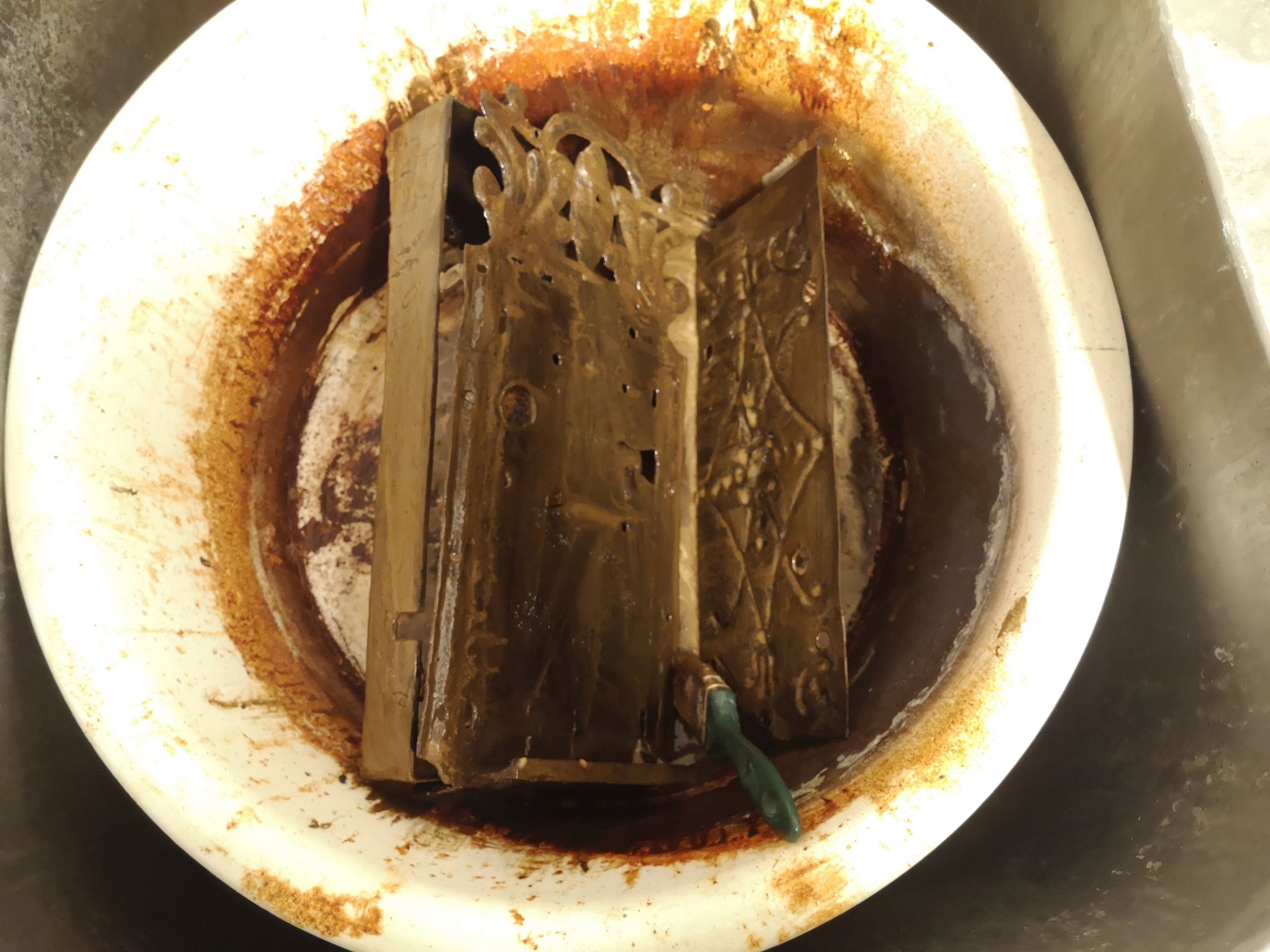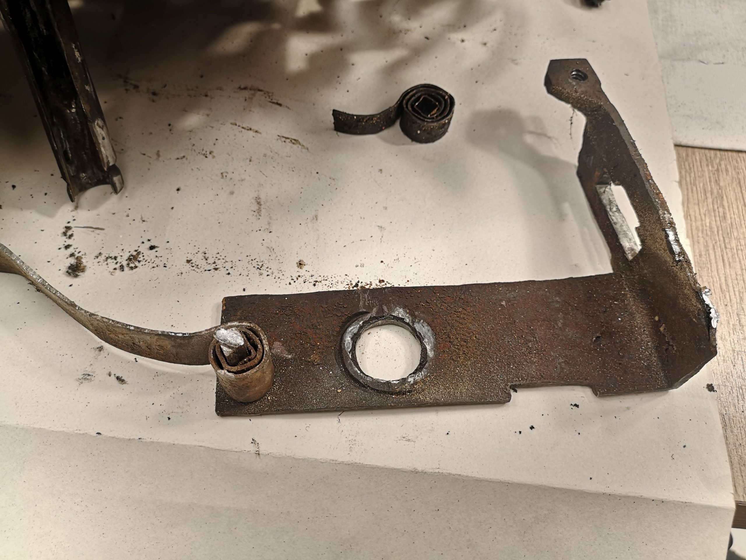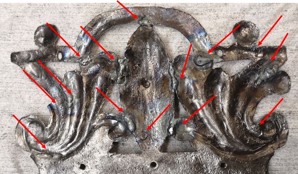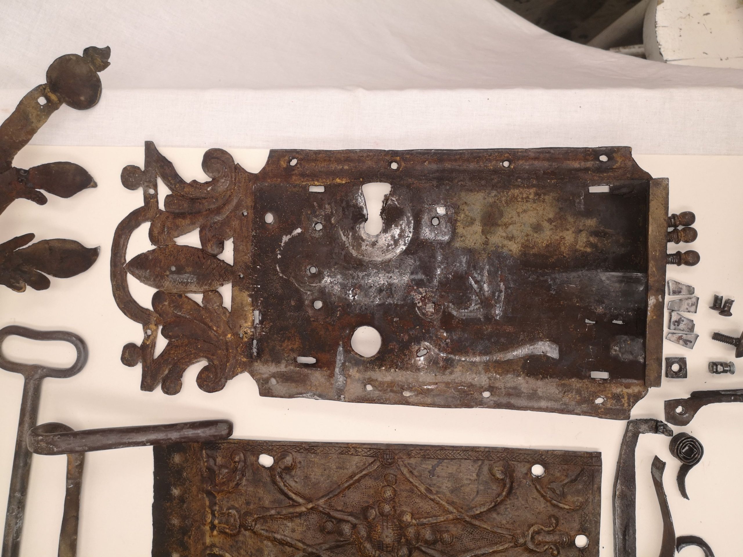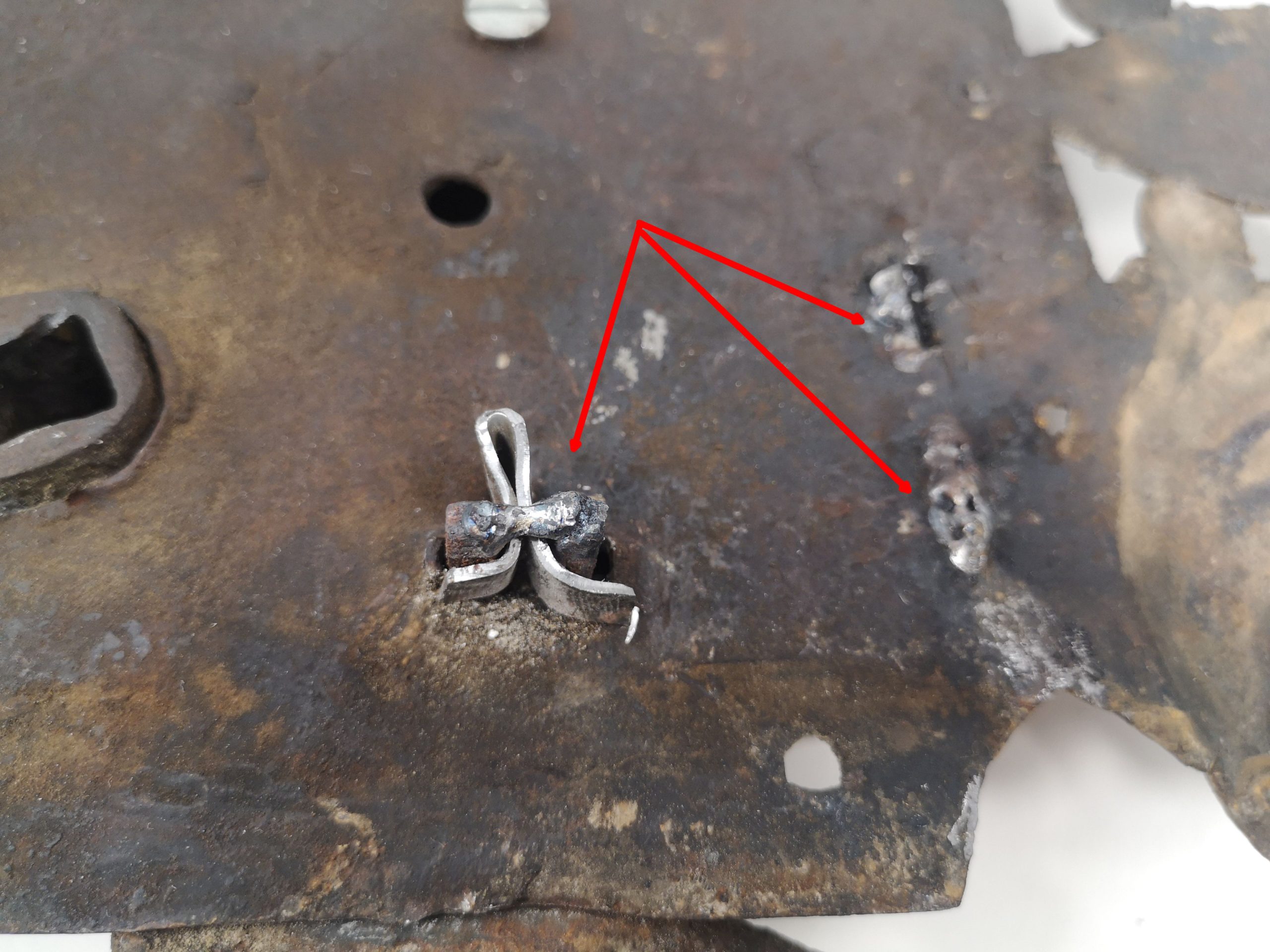A szétszerelt zár hibái: korrodált, szennyezett, nyomokban még látható a régi festés, deformálódott, hiányos, szakszerűtlenül „javított”.
