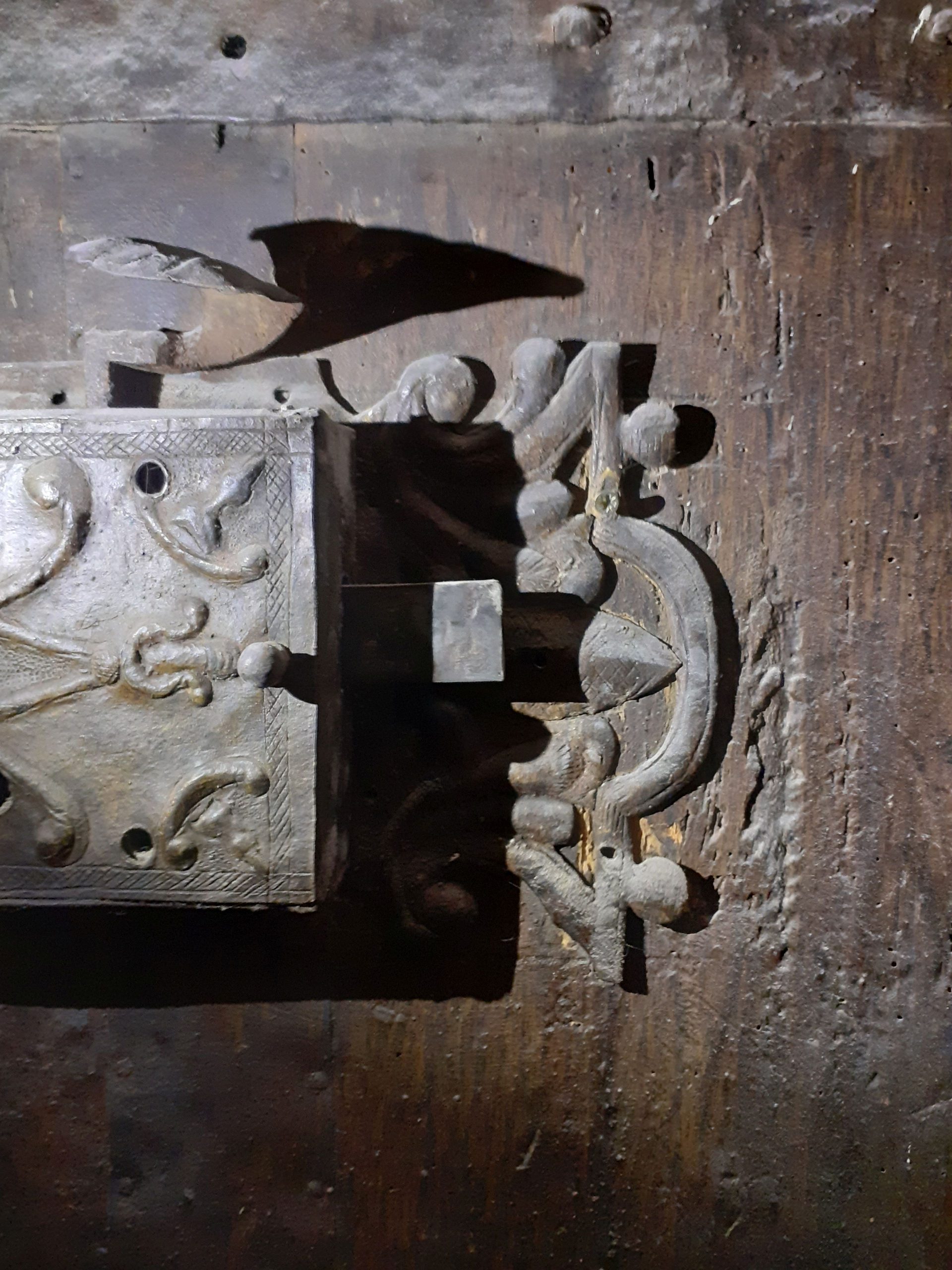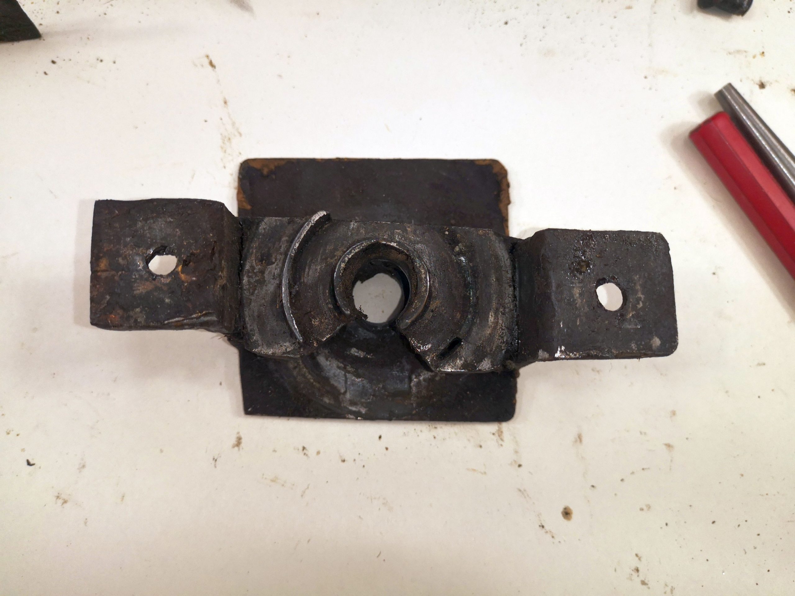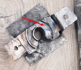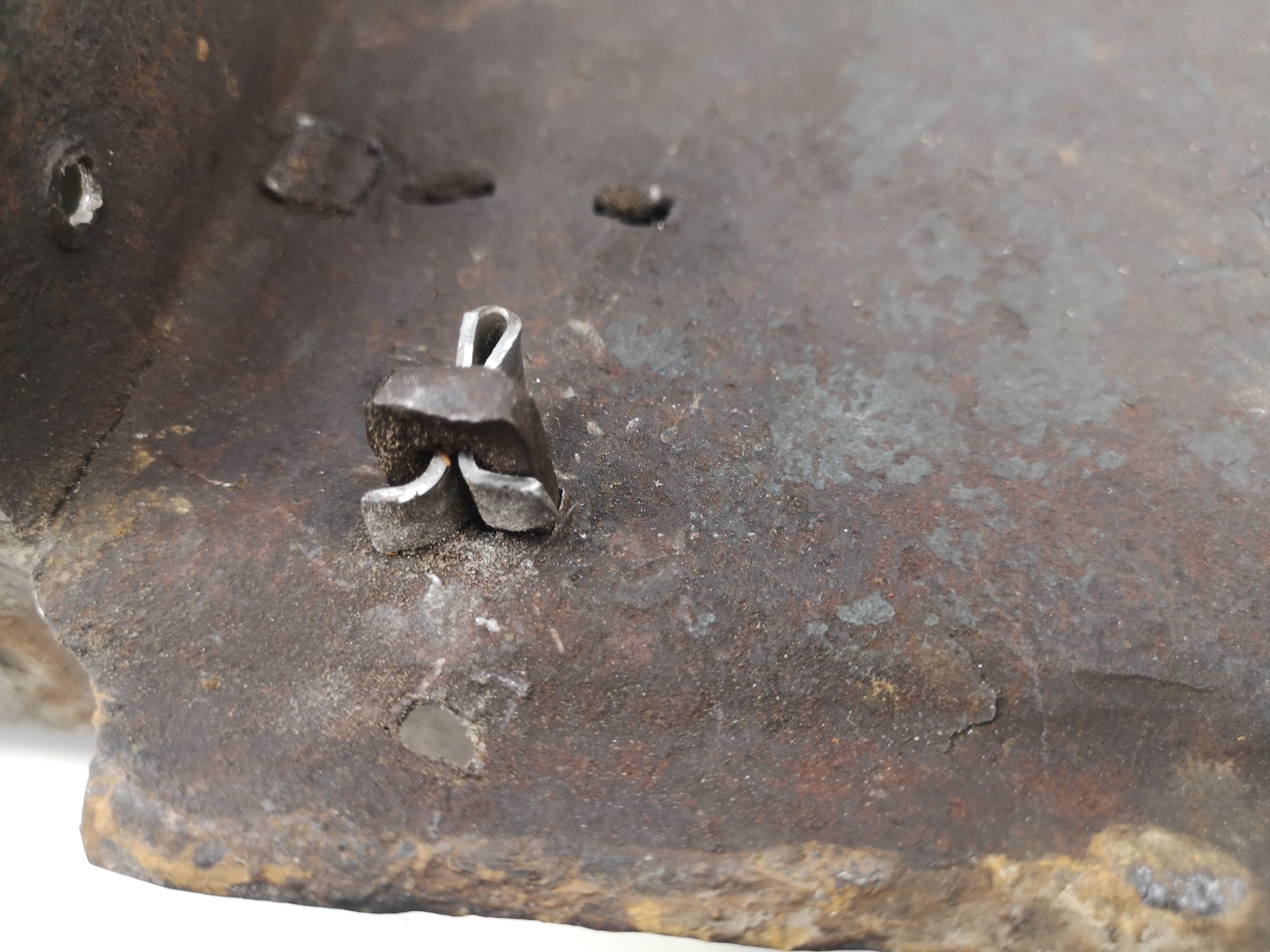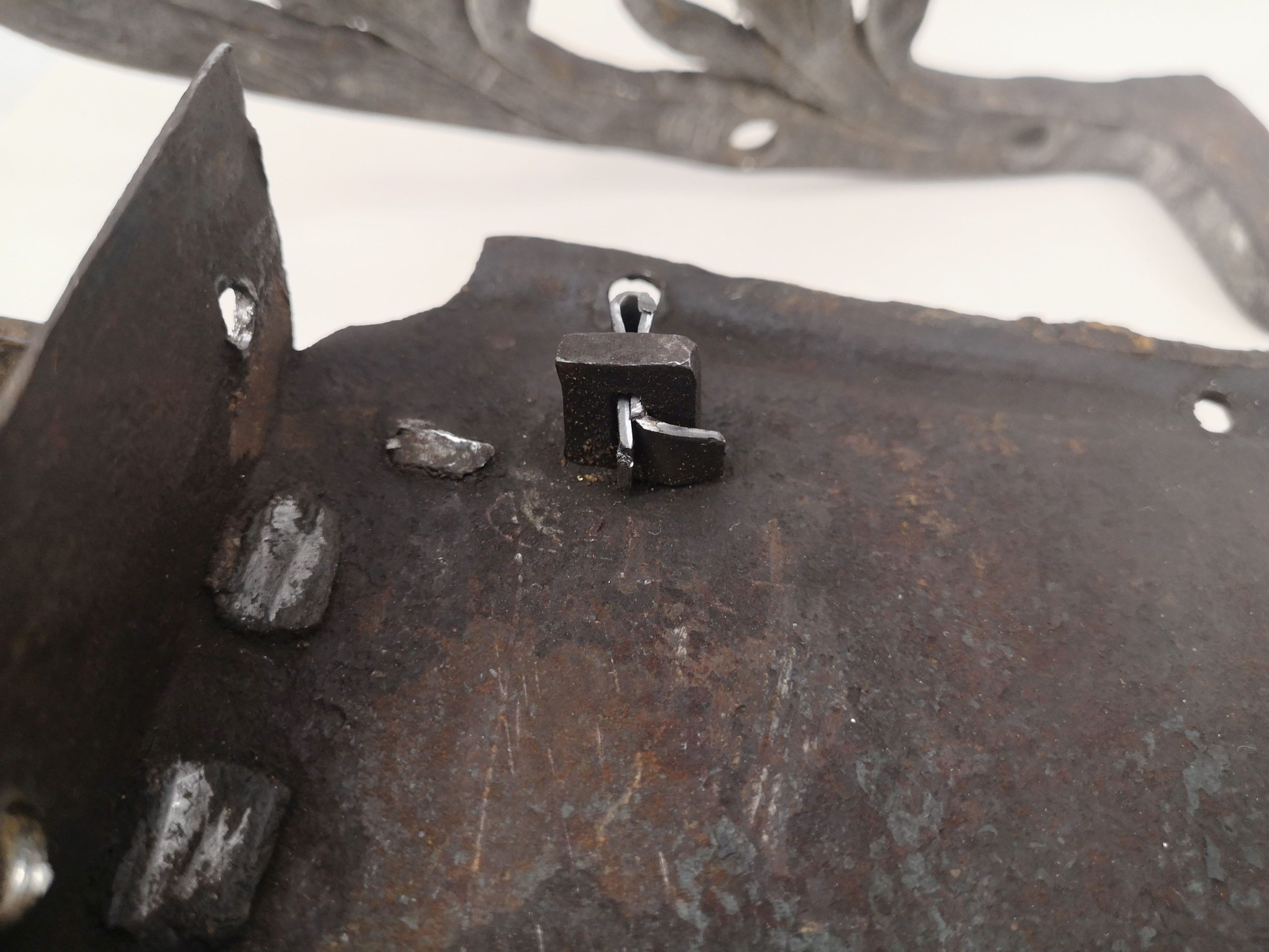 A szétszerelt zár hibái: korrodált, szennyezett, nyomokban még látható a régi festés, deformálódott, hiányos, szakszerűtlenül „javított”.